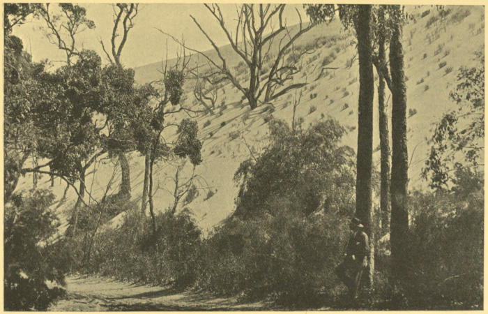 The scenery of this district is far more pleasing than the barrenness of Magnet township. There are plenty of enormous emus scudding through the scrub, and occasionally a few kangaroos enliven the scene. Some of the big hills are completely riddled with enormous holes made by the earthworm. It must have taken centuries to make these tunnels. I thought they must be mining excavations, but one of the mining managers,[324] who is a mining expert and engineer, and who ought to know, told me they were the work of earthworms.