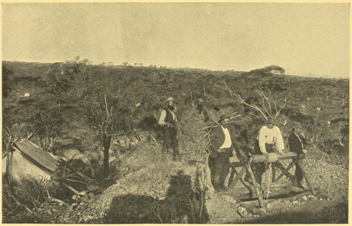 Native wells or “namma-holes” have saved may a prospector from death by thirst, and men well used to the Bush soon know how to find them. Some of the wells are not more than two feet deep; others go down to ten or twelve feet, and are usually found by rock-holes, or certain trees that are near them. Some wells have a small drive at the bottom, so arranged by the blacks that, when the water gets shallow, it cannot be seen from the top of the hole. The old prospectors have learned from the blacks how to find these oases in the desert, but “new chums” might pass dozens while parched with thirst and never find one.