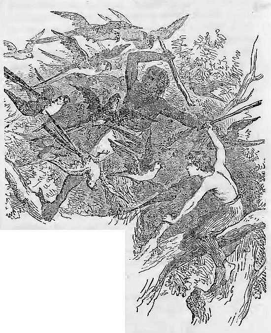 The first act of hostility was a flight of arrows, which fell short of the mark. Seeing that the distance was too great for them to do any havoc, the six who had been propelling the igarité dropped their bows, and once more took to the paddles.