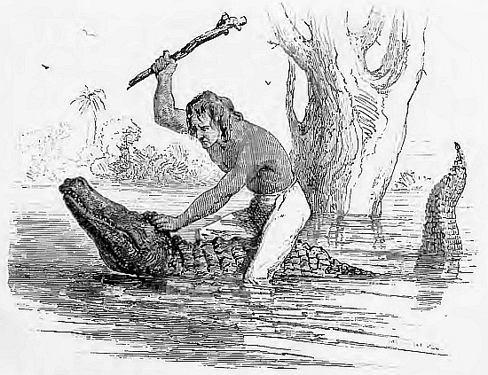 In another instant he had taken up the harpoon, with the long cord still attached to it, and which he had already secured to the stern of the igarité. In still another he was seen standing near the stern, balancing the weapon for a throw. One more instant and the barbed javelin was heard passing with a crash through the ribs of the savage archer! “Pull on! pull on!” cried he; and the three paddlers responded to the cry, while the pursuing savages, astounded by what they had seen, involuntarily suspended their stroke, and the harpooner, impaled upon the barbed weapon, was jerked into the water and towed off after the igarité, like one of his own floats in the wake of a cow-fish.