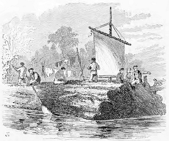 When we say of singular construction, we mean singular to one unaccustomed to the navigation of Amazonian waters. There the craft in question was too common to excite curiosity, since it was nothing more than a galatea, or large canoe, furnished with mast and sail, with a palm-thatched cabin, or toldo, rising over the quarter, a low-decked locker running from bow to midships,—along each side of which were to be seen, half seated, half standing, some half-dozen dark-skinned men, each plying, instead of an oar, a paddle-blade.