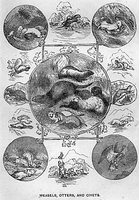 The Coati is exclusively South American. This, unlike the racoon, sleeps at night, and prowls during the day. It is also an expert tree-climber, and has a peculiarity in this respect; viz., it descends a tree head foremost, which no other animal of its order can do. It is equally as fierce and carnivorous as any of the badgers; and its prey, as with the racoon, consists of birds, their eggs, and small quadrupeds. It feeds also upon insects; and will turn over the earth with its long proboscis-like snout. When drinking it laps like the dog. In eating, it uses its fore-paws to carry the food to its mouth, though not as squirrels and monkeys do. On the contrary, it first divides the flesh, or whatever it may be, into small morsels, and then raises these to its mouth by impaling them on its claws as on a fork!
