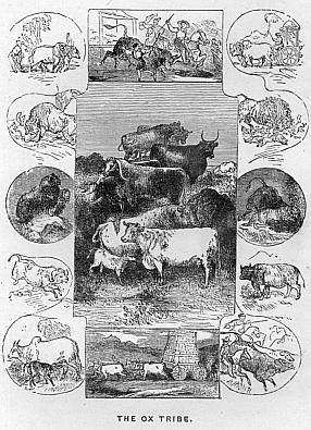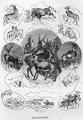 In North Africa—in the Sahara Desert—exists a large species, called by the Arabs the Wild Ox. It is one of the clumsiest in shape of the whole tribe. In the south two kinds are near akin to it—the Harte-beest or Secaama, and the Sassaby or Bastard harte-beest. The Korrigun is another of these large antelopes, belonging to Western Africa; and the Bonte-boc and Bles-boc are two similar kinds, existing in the country of the Hottentots. The Bosch-boc, or Bush-goat, is still another of the southern antelopes, which derives its name from its dwelling-place—the bushy thickets—out of which it never shows itself; and, in addition to all these, there is the Decula of Abyssinia, the Guib of the western coast, the Ingala of Natal, and the Broad-horned antelope of the Bight of Biafra.
