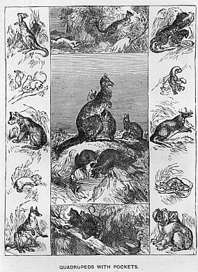 The marsupial animals bring forth their young before they are fully developed. The mother places the mouth, of what is little more than a foetus, to her teat; and there it remains till it is able to go alone. The pouch covers the teats, and serves to protect the young, while the process of development is going on. Even after the little ones are able to run about, they continue to use this singular nest as a place of repose, and a refuge in case of attack by an enemy!