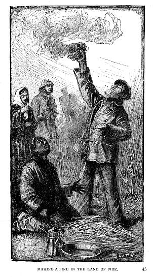 Orundelico also shows them the Fuegian mode of fire-kindling, the first sparks being obtained from the cathow, or fire-stone, (Note 4), two pieces of which every Fuegian carries about him, as a habitual smoker does his flint and steel or box of matches. The inflammable material used by the natives is of three sorts: the soft down of certain birds, a moss of fine fibre, and a species of dry fungus found attached to the under side of half-rotten trees. The cathows, rasped against each other like flints, emit sparks which ignite the tinder, when the flame is produced in the way that the old sealer has employed since they have been in the country.