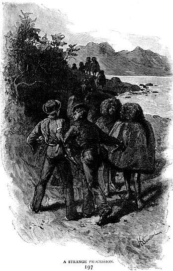 From the information they have gained about the Yapoos, which shows them to be ferocious and treacherous, and hostile to white men, Captain Gancy decides upon running out to seaward through the Murray Narrow—a resolve in harmony with the advice given him by his Fuegian host and the trusted Seagriff as well. The inlet in which they are is just outside the entrance to the Narrow, on its western side, and once round a separating tongue of land, they will be in it. As if fortune favoured their taking this route instead of following the Beagle Channel, a fine breeze has set in from almost due north, and is still blowing when the spoil-laden hunters return.