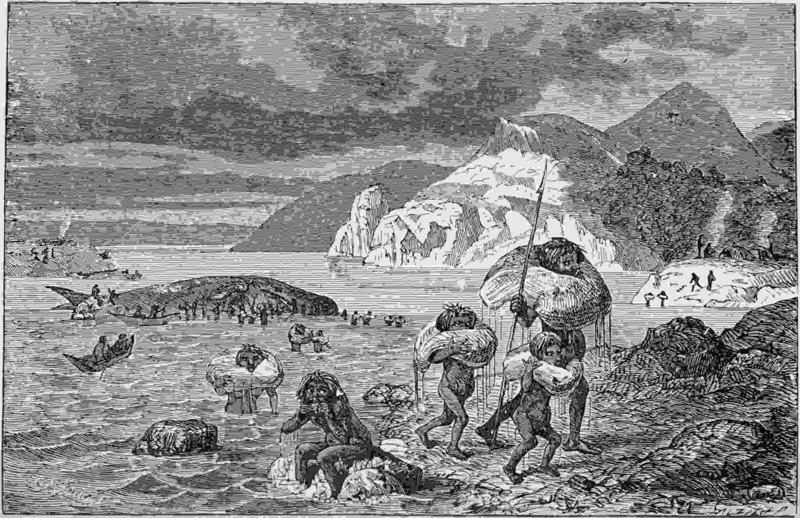 Their whole system of life is abject in the extreme. Although provided with fires, their food is eaten raw; and a fish taken from the water will be swallowed upon the instant,—almost before the life is gone out of it. Seal and penguin flesh are devoured in the same manner; and the blubber of the whale is also a raw repast. When one of these is found dead upon the beach,—for they have neither the skill nor courage to capture the whale,—the lucky accident brings a season of rejoicing A fleet of canoes—if it is to be reached only by water—at once paddle towards the place; or, if it be an overland journey, the whole community—man, woman, and child—start forth on foot. In an hour or two they may be seen returning to their hut-village, each with a 458large “flitch” of blubber flapping over the shoulders, and the head just appearing above, through a hole cut in the centre of the piece,—just as a Mexican ranchero wears his “serape,” or a denizen of the Pampas his woollen “poncho.” A feast follows this singular procession.
