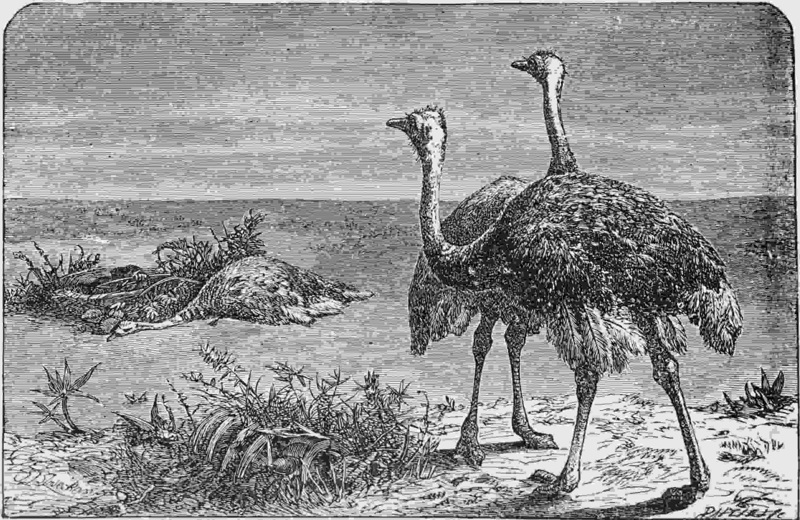 The Patagonian boys and women often employ themselves in seeking out the ostriches’ nests, and robbing them of their eggs,—which last they find good eating. In the nests of the smaller species which we have already stated to be the most common in the Patagonian country,—they are not rewarded so liberally for their trouble. Only from sixteen to twenty eggs are hatched by the rhea Darwinii and about twenty-five to thirty by the rhea Americana. It will be seen, that this is far 436below the number obtained from the nest of the African ostrich (struthio camelus),—in which as many as sixty or seventy eggs are frequently found. It would appear, therefore, that the greater the size of the bird, belonging to this genus the greater the number of its brood. Both the American rheas follow the peculiar habit of the true ostrich: that is, several hens deposit their eggs in the same nest; and the male bird assists in the process of incubation. Indeed, in almost every respect—except size and general color of plumage—the American and African ostriches resemble each other very closely; and there is no reason in the world why a pedantic compiler should have bestowed upon them distinct generic names. Both are true camel birds: both alike the offspring, as they are the ornament, of the desert land.