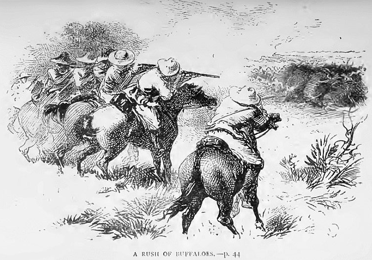 While engaged in this practice, they became witnesses of an odd spectacle afforded by an old bull, which had been fired at and hit just behind the ear, too far back to give him his death wound. It seemed but to drive him crazy; as he commenced spinning round and round on the water, as a sheep in a pasture field, attacked by the “turn giddies.” But he was not permitted to make many gyrations, ere a volley from the raft brought his spin to an abrupt termination, along with his life.