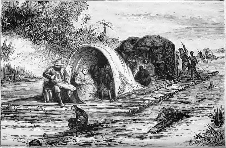 A broad river coursing eastward for the Indian Ocean, nearly in the latitude of the Tropic of Capricorn. Drifting down it is a large raft, with many people upon it, and that which, seen from a distance, might be taken for three trek-waggons. On nearer view, however, these are discovered to be but waggon—tilts, supported on upright posts instead of wheels. Needless to say, they are the same which have been all along sheltering our party of migrating Boers, and the river the Limpopo; while the large raft is a composite structure of the three small ones lashed and braced together, with some additional timbers to give it greater size and strength. The original beams of koker-boom had been carried across the second portage, put together as before, and brought on down the branch stream, without encountering any other interruption. On reaching its mouth, however, it was deemed better to continue the voyage with the three united in one, and the union has been made. In the new arrangement the waggon-tilts still hold position on the quarter-deck, side by side and parallel to one another; while only one of the steering-oars—the central one—is retained. The sheds are also re-erected on the fore-deck, with the cargo collected into one pile, and instead of three fire-hearths, a single one now serves for all. With the thermometer often at 100 degrees in the shade it is not there for warmth, but culinary needs.