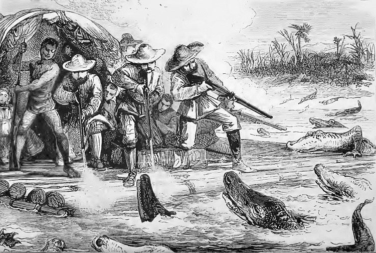 Although an astounding and fear-inspiring spectacle, they upon the rafts were, in a manner, prepared for it. On the nights preceding they had heard loud noises below, as the bellowing of a hundred bulls, knowing them to be caused by crocodiles, and only wondering that there were so many in one place. Now seeing the reptiles themselves their wonder was undiminished, with no clearer comprehension of why they were thus congregated.