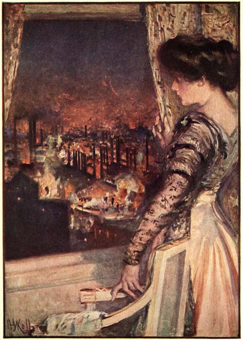 He laughed into her eyes, heeding nothing she said. He was drawing off her gloves, and he flung them down and kissed her hands and held them resisting to his face. Then he turned to the window, his arm clasping her, and looked out upon the darkling city that lay below—a vast amphitheatre, with serried ridges of twinkling lights rising on the distant hills to meet the stars. The glow of the streets and shops stole upward to their window in the towering building. Far away along the river the huge organ-pipes of the great mills sent their cloud of smoke and flame into the amber dusk. Trains moved like bright serpents along the valley. The strength of the iron hills thrilled through him as he looked upon the torches of the gods of power; the city of his birth sang a great psalm to him as he stood there beside the woman he loved.