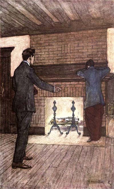 The sun was resting his fiery burden on the dark edge of a wood on the western horizon.[187] The front door of the bungalow was ajar and Mrs. Redfield crossed the piazza and peered in. The place was clean and freshly papered: a fire burned m the fireplace—no mere careless blaze of litter left by workmen, but flaming logs that crackled cheerily. Her memory distributed her own belongings; here had been the table and there the couch and chair; and she saw restored to the bare walls the pictures that now cluttered the attic of the home she had established with Marian, that had once hung here—each with its special meaning for the occupants.