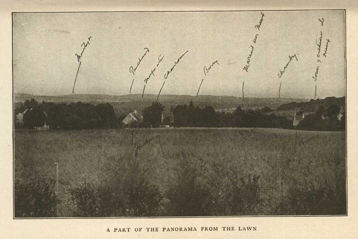 From the lawn, on the north side of the house, I command a panorama which I have rarely seen equaled. To me it is more beautiful than that we have so often looked at together from the terrace at Saint-Germain. In the west the new part of Esbly climbs the hill, and from there to a hill at the northeast I have a wide view of the valley of the Marne, backed by a low line of hills which is the water-shed between the Marne and the Aisne. Low down in the valley, at the northwest, lies lie de Villenoy, like a toy town, where the big bridge spans the Marne to carry the railroad into Meaux. On the horizon line to the west the tall chimneys of Claye send lines of smoke into the air. In the foreground to the north, at the foot of the hill, are the roofs of two little hamlets,—Joncheroy and Voisins,—and beyond them the trees that border the canal.