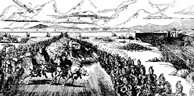 He swung the car around just as, with a rattle and a roar, a score of chariots dashed out of the great gates and the horses came galloping down the road. The ranks of the infantry opened to permit pursuit of the retreating skirmishers. The clumsy vehicles rattled and bumped behind flying hoofs at a rapid clip, the men in them hanging on to the reins and keeping their footing by a miracle. Gay cloaks streamed backward in the wind, and gold gleamed on the horses' harness.
