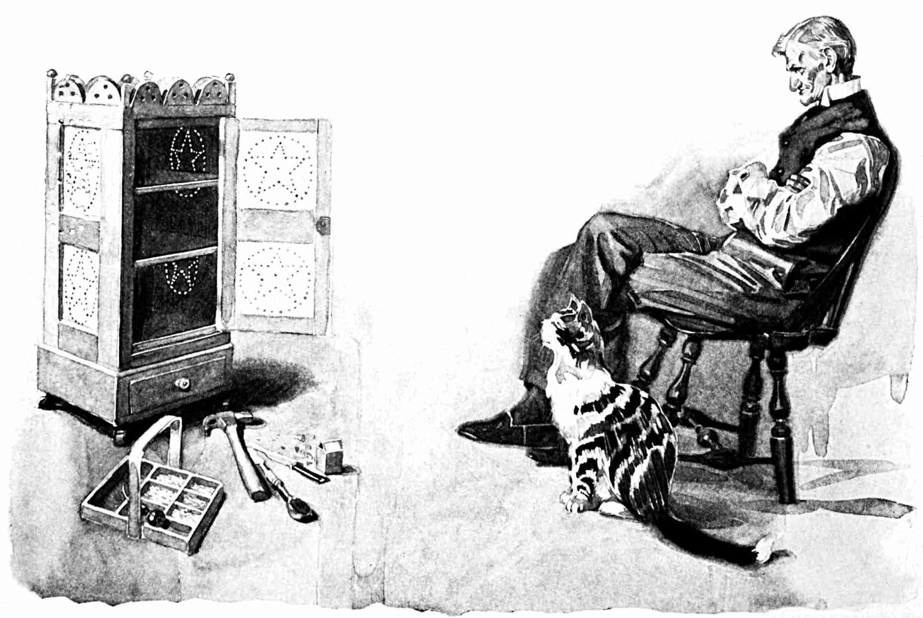 But Madigan came in just then, took his seat at the head, looked mechanically for the ban[Pg. 344]ished dog and the cat, and Dusie, chirping madly in her cage to attract his attention to the fact of her cruel and unusual imprisonment. He cleared his throat and took up the carver—and immediately Miles Morgan was conscious of an unbending of the small Madigans—a cuddling together, so to speak, and a swift interchange of impressions.