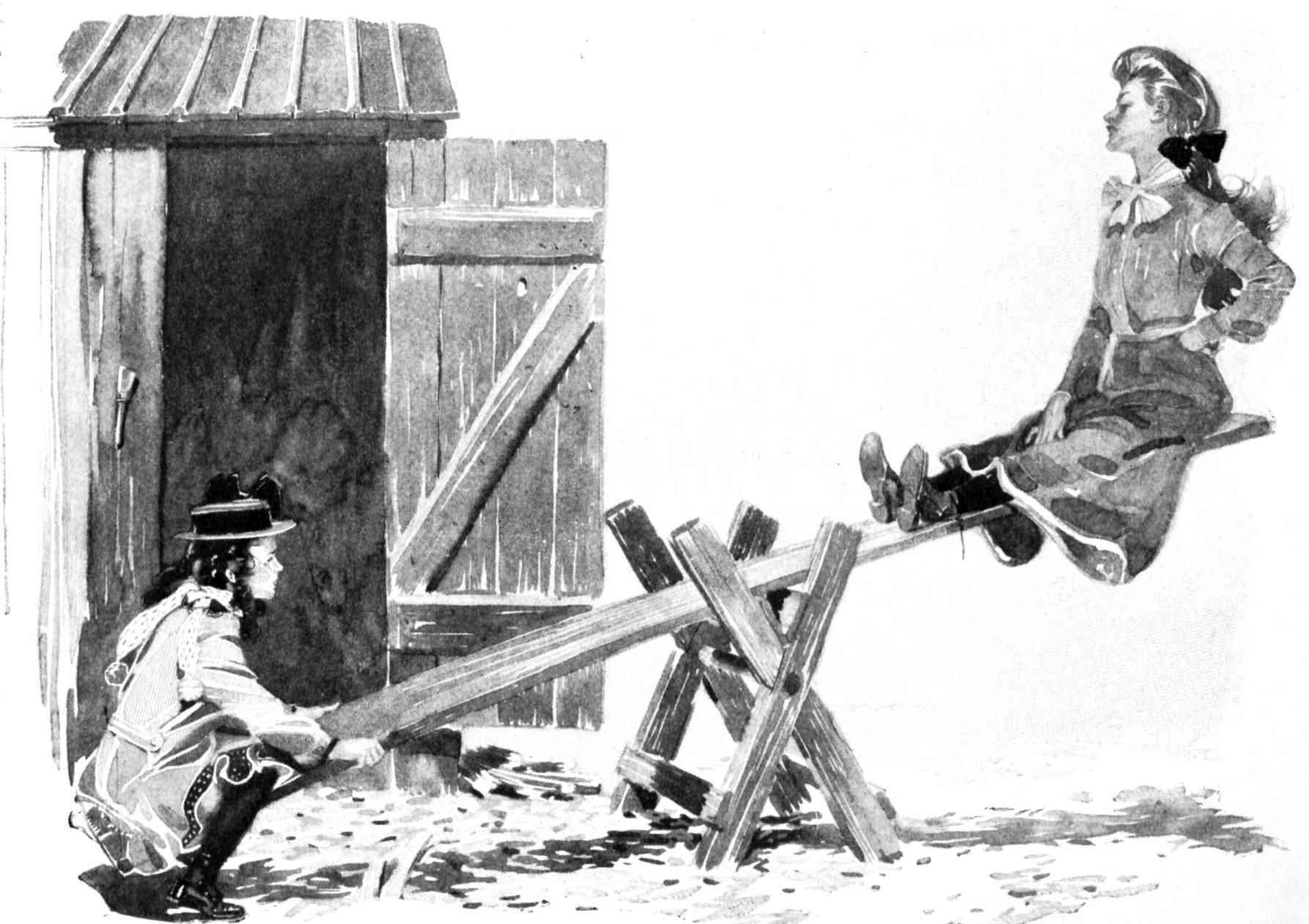 An impressionable young Irishman, who had come out upon the piazza to smoke a cigar and think himself back into his usual poise after a day full of new experiences, had his attention attracted by the strumming on the piano; and glancing in through the open window, he saw a slender, graceful girl, her dark head rising lightly from the sailor collar of a pink gingham blouse. She was balancing lightly as she walked, keeping time to the rhythm, and followed by a procession of children in single file. (A belief in the efficacy of motion to stimulate [Pg. 357]one's power of improvisation made Old Mother Gibson the liveliest of games.) And arriving at the center of the stage, she delivered herself in a singsong of the following: