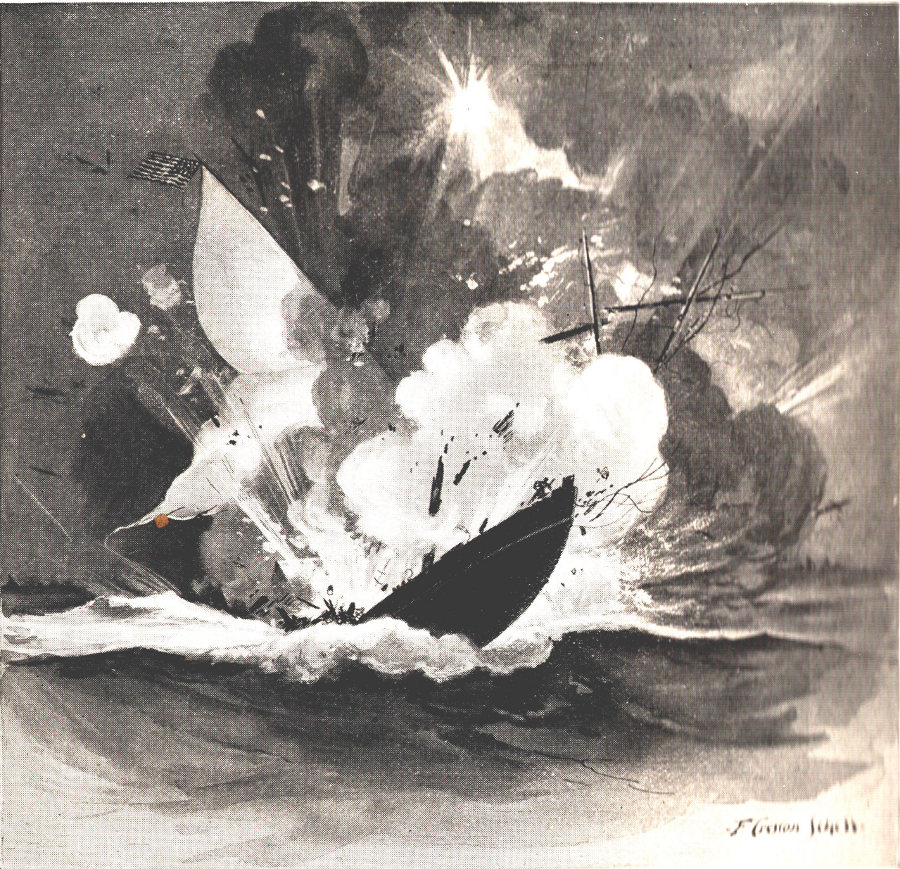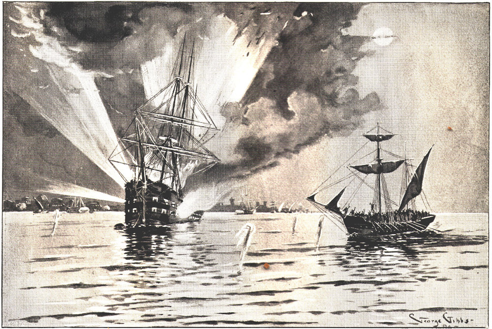 Those on the American ships heard the frightful roar of the hundred barrels of gunpowder that seemed to explode in an instant of time, and, stunned by the concussion, they could only see a mast and sail of the ketch as they flew, blazing, up to the lurid sky, and then sank in the more lurid water.
