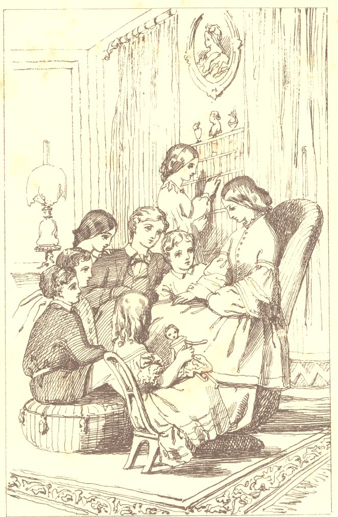 How could mamma have ventured upon that cosy nap in the arm-chair by the fire, if she had been harassed by wondering what the children were about? Whereas, as it was, she had overheard No. 8 begging the one they all called “Aunt Judy,” to come and tell them a story, and she had beheld Aunt Judy’s nod of consent; whereupon she had shut her eyes, and composed herself to sleep quite complacently, under the pleasant conviction that all things were sure to be in a state of peace and security, so long as the children were listening to one of those curious stories of Aunt Judy’s, in which, with so much drollery and amusement, there was sure to be mixed up some odd scraps of information, or bits of good advice.