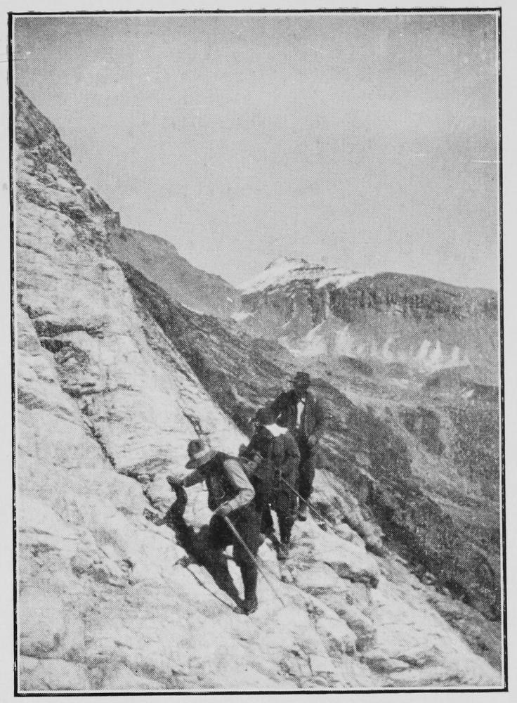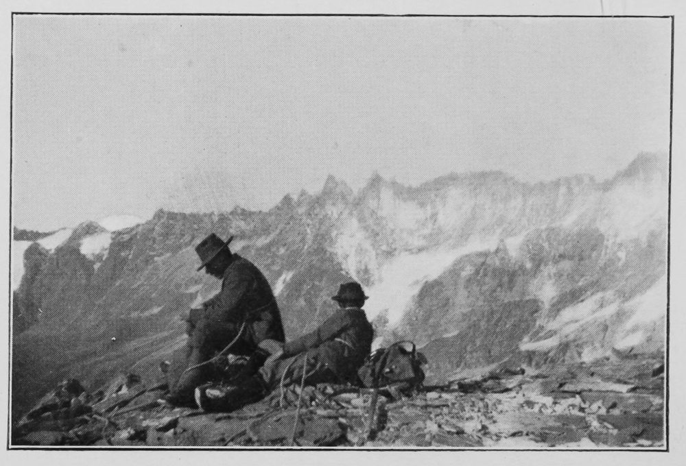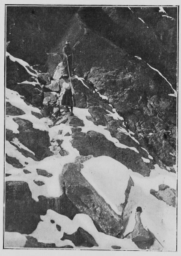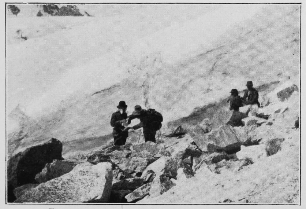 The last steep bit near the top—At the end of a hot day—An instant’s halt to choose the best way up a steep wall of rock—The ice-axes are stowed away in a crack, to be brought up by the last man | " " 6 |