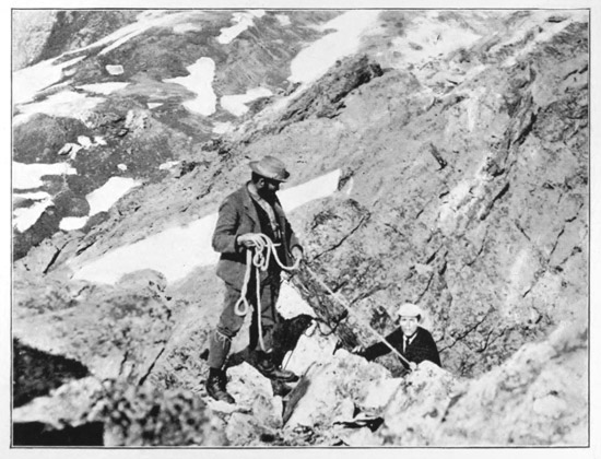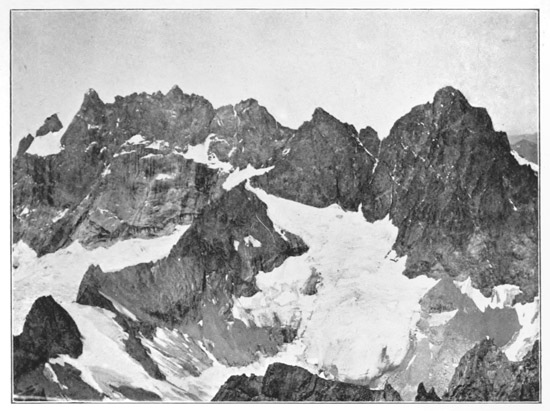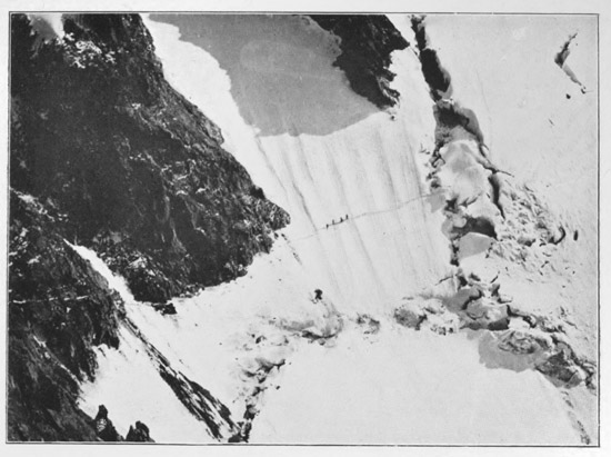 [9] The remains of this rope hung for years where Mr Pilkington had placed it, and when I ascended the Meije I saw the bleached end of it hanging over as sickening looking a place as I have ever desired to avoid. The ordinary route passes more to the west.
