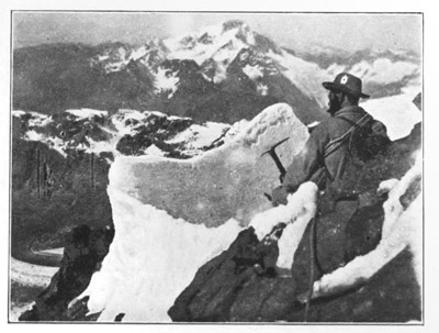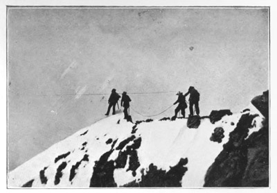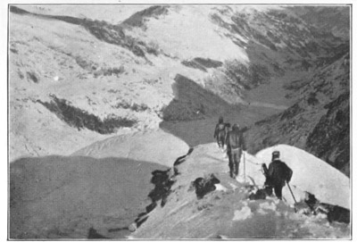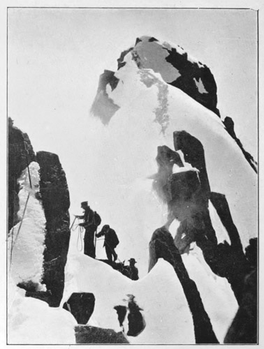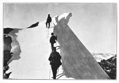 [6] These snow-cornices are common on the crests of high mountain ridges, and it is always prudent (just before arriving upon the summit of a mountain or ridge), to sound with the alpenstock, that is to say, drive it in, to discover whether there is one or not. Men have often narrowly escaped losing their lives from neglecting this precaution.
