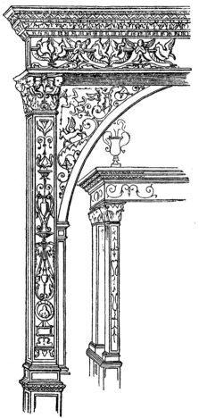 Attached to the church, are the cloisters of the Carmelite convent to which the church formerly belonged, built in the beginning of the fifteenth century by Bertram de Rosmadec, who had so much contributed to the completion of the cathedral at Quimper. The square is surrounded by an interlaced [pg 261] circular arcade, forming trefoiled pointed arches, all in excellent preservation. The access to the cloisters is through the conventual building, now a private house and garden, the proprietor kindly granting us permission.