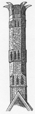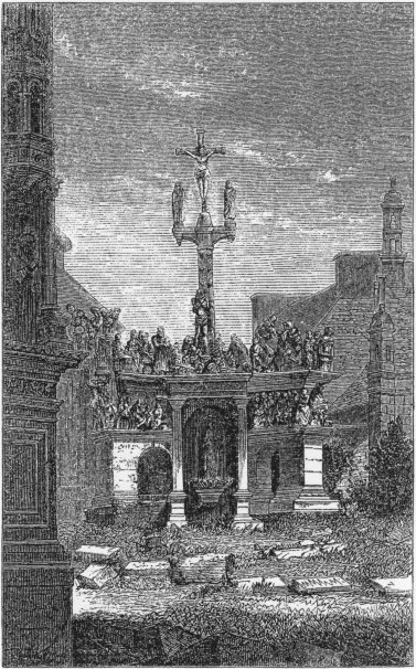 The principal building at Dol is the Cathedral, built of grey granite, in the style of many of our English churches. On the south is the "porte episcopale," a large projecting porch with mullioned sides, and, near it, a smaller porch with a central column semée of hearts, the "armes parlantes" of Bishop Cœuret who built it. The clustered columns of the nave, consist of a central pillar surrounded by four others running up to the roof, so slender and delicate that they are united to the centre by small bars of iron. Over the high altar is an enormous wooden crozier, carved and gilt, from which the Host is suspended. [pg 032] A beautiful Renaissance tomb on the north side of the cathedral was raised in 1507 to the memory of Bishop James, who died three years before. The sculpture is much mutilated, but the arabesques are most delicately and elegantly chiselled. It is supposed to be the work of Jean Just of Tours, sculptor of the magnificent tomb of Louis XII. and Anne of Brittany, erected at St. Denis by order of Francis I.