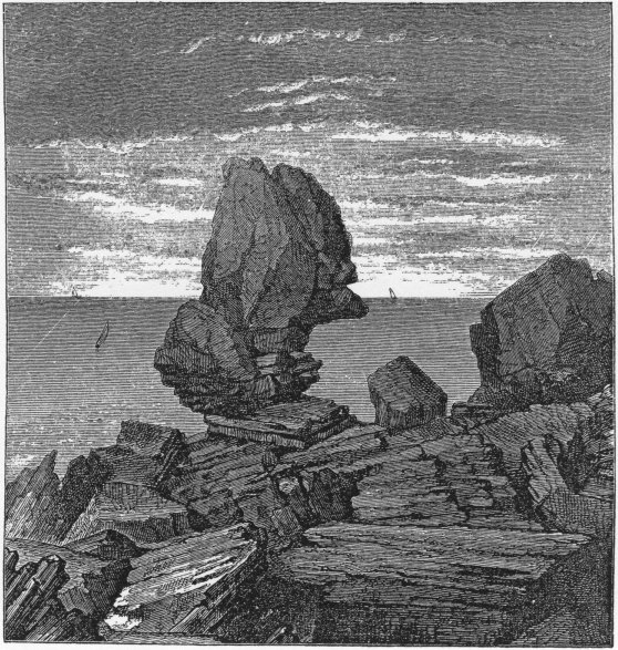 We first walked to the rocking stone on the slope of a steep hill, considered the third largest in Brittany; the block forming a kind of double cube, that is, about twice the length of its height. It requires a very slight impulse to make it rock. This "fairy stone" is often consulted by the peasants. In the ravine close by, below the path, is what is called the "Cuisine de Madame Marie," but termed in the guide-books the "Ménage de la Vierge;" a recess [pg 301] formed of large masses of fantastically shaped granite rocks, through which a small stream of water flows, arriving thither from the pond, by a subterranean course. One stone, hollowed out, is called the écuelle of the Virgin, and others have each the name of some different utensil requisite for the "Ménage" of our Lady. The young people managed to scramble to the bottom.
