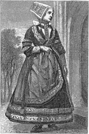 At Plonevez-Porzun we turned off the Crozon road, and about two miles further arrived at the [pg 281] chapel. The road all the way was lined with peasants walking to the Pardon. The young men of Douarnenez wear blue jackets, embroidered in colours, with rows of plated buttons, the sleeves and waistcoat of a darker blue than the jacket, scarlet sashes, some with plaited bragou bras and shining leather gaiters; but most of them wore trowsers, their hair long, and their hats with two or three rows of coloured variegated [pg 282] chenille. The women had square caps, and aprons with bibs. Those who were in mourning wore light yellow caps, called "bourladins," stained that colour with beeswax or saffron.