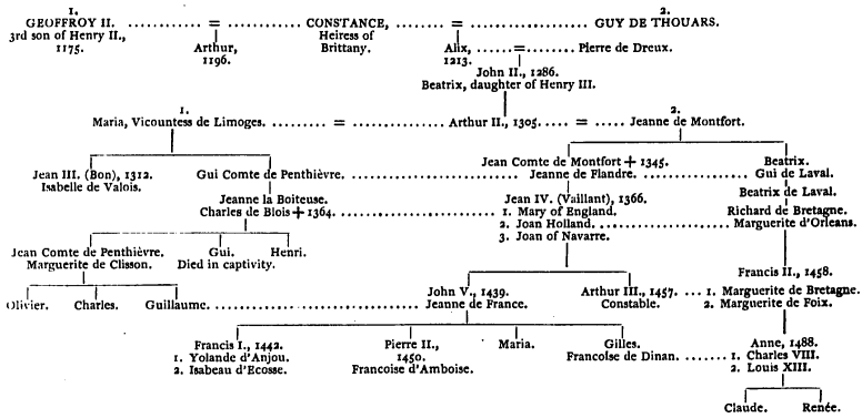 Dinan—Ascent of the Rance—Statue of Du Guesclin, 44—Siege of 1359—Duel of Du Guesclin and Thomas of Cantorbéry, 45—Castle of Montfilant—Story of Gilles de Bretagne, 46—Lunatic Asylum—Castle of Dinan, 50—Church of St. Sauveur, 51—Museum, 52—Environs—Château of La Bellière, 54—Château of La Garaye—Count Claude de la Garaye and his Wife, 57—Jugon, 61—Castle of La Hunaudaye, 62—Legend of La Hunaudaye, 63—Forest of La Hunaudaye—The Chouan War, 66.