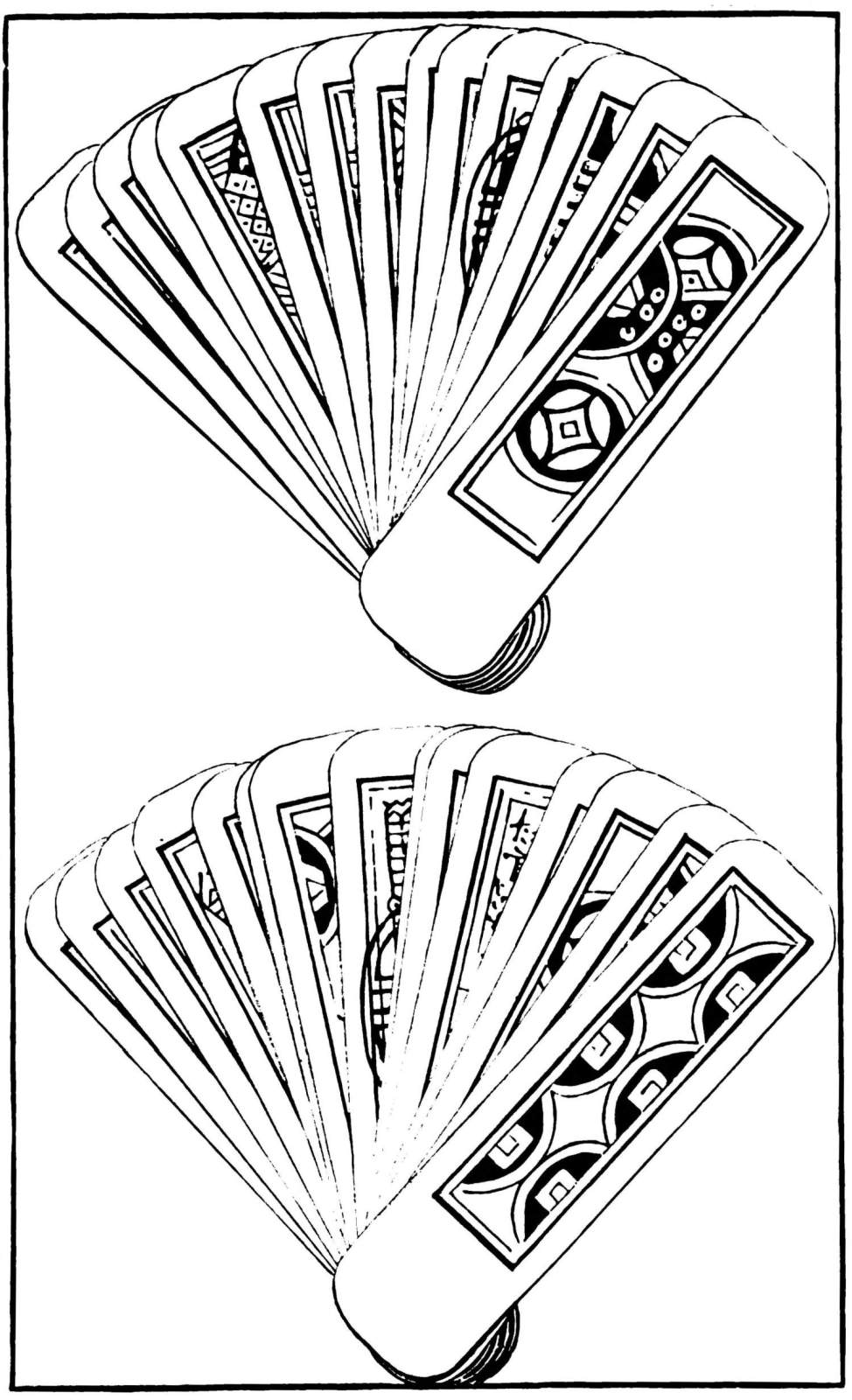 The first cards known in Europe, and which were named Tarots, Tarocchi, etc., seem to differ in almost every respect from those of the fifteenth century, although these probably inspired their invention. The latter resemble much more those of the present day than they do the original Tarots. The first packs consisted of seventy-eight cards,—that is, of four suits of numeral cards; and besides these there were twenty-two emblematical pictured cards, which were called Atous, or Atouts,—a word which M. Duchesne, a French writer, declares signifies “above all.” This word used in French has the same meaning as our word Trump. The marks which distinguish the Tarot suits are usually Swords, Cups, Sticks, and Money; and each one consists of fourteen cards, ten of which are “pips” and three or four “coat” cards,—namely, King, Queen, Knight, and Knave. The Queen was not always admitted. These suits seem to be the origin of the modern packs; and the emblems used on them have been adopted in many countries where the Atout part was discarded while the rest of the pack with its original symbols was retained.