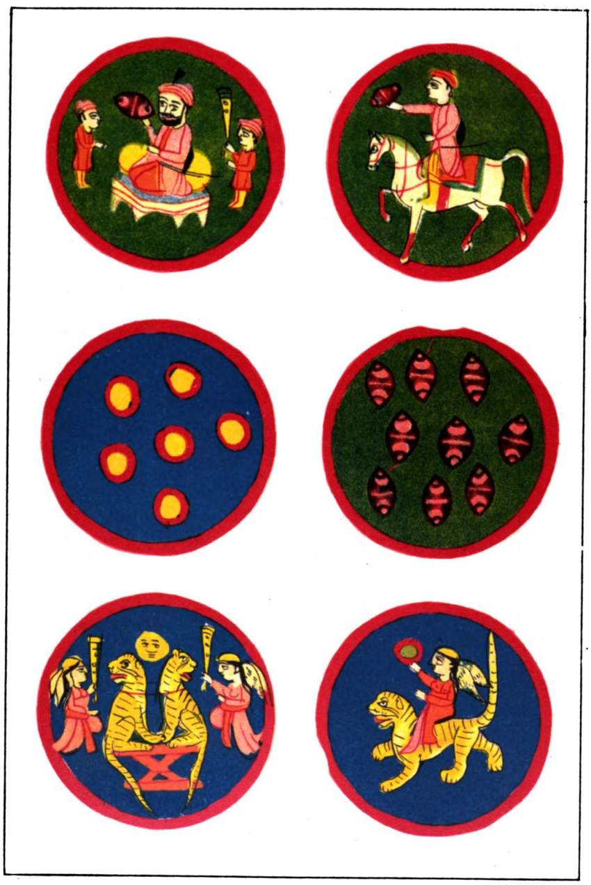There is still in existence a curious pack of[Pg 194] cards which were presented to Capt. D. Cromline Smith by a Brahmin of India in 1815, which is mentioned by Mr. Chatto. They were supposed to be a thousand years old. The Brahmin considered them to be a great curiosity, as they had been in his family from time immemorial. He did not know whether or not they were perfect, but believed that originally there were two more colours or suits. He said they were not the same as the modern cards, that none knew how to play with them, and that no books give any account of them. The pack consists of eight suits, each containing two honours and ten common cards. The backs are green, and they are painted in many different colours. Mr. Chatto remarks, that if they are even one hundred years old they must have been preserved with great care, and he is inclined to doubt their extreme antiquity.