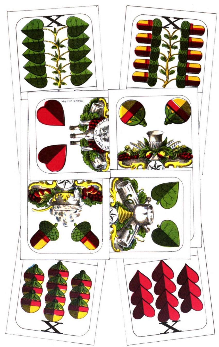 The Germans now call two of their suits Roth and Grün, or Red and Green, the emblems of which are a heart and a leaf.