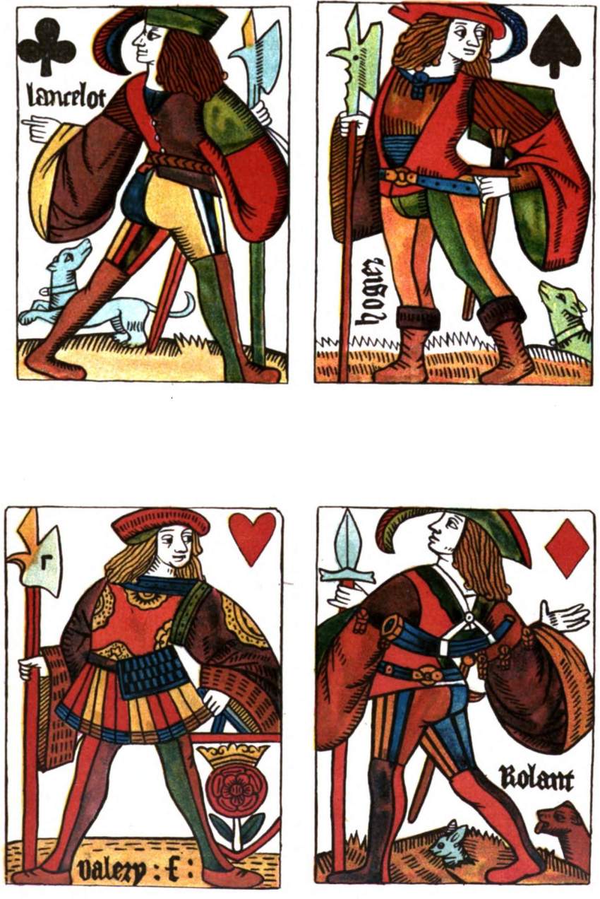 In the German pack the Knave has been called Landsknechte (Free Lancer), and from this has been derived the name of a well-known game which the French call “Lansquenet.” In early French packs the same card was sometimes termed Trichem, which was also the name of a formidable band of robbers who at one time committed such horrible ravages in France that the Popes were obliged to preach a crusade against them.