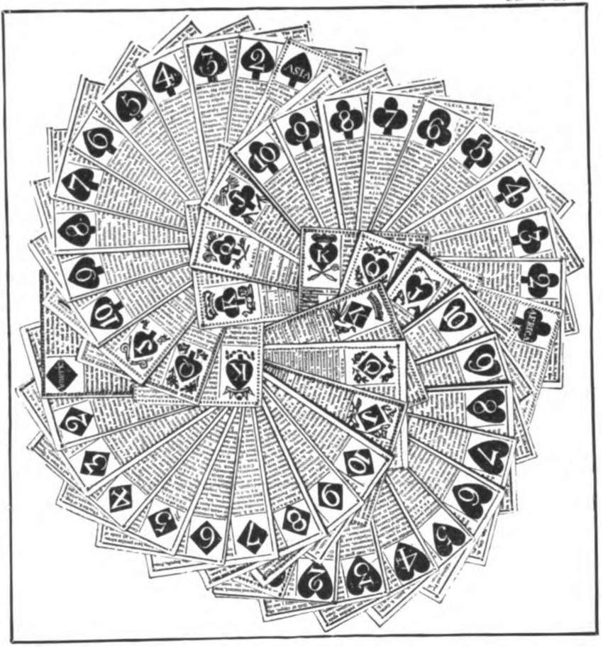 The fascination that games have for some people led to their being carried into queer places and strange company. The preacher’s catastrophe and the soldier’s apology have already been related; but cards have been played on the battle-field as well as by the home fireside, they have been used when travelling and even at the play, as one writer mentions that during a visit in Florence he was invited to join a game in an opera-box, where he was told that “good music added greatly to the pleasure of a whist-party, that it increased the joy of good fortune and soothed the affliction of the bad.”