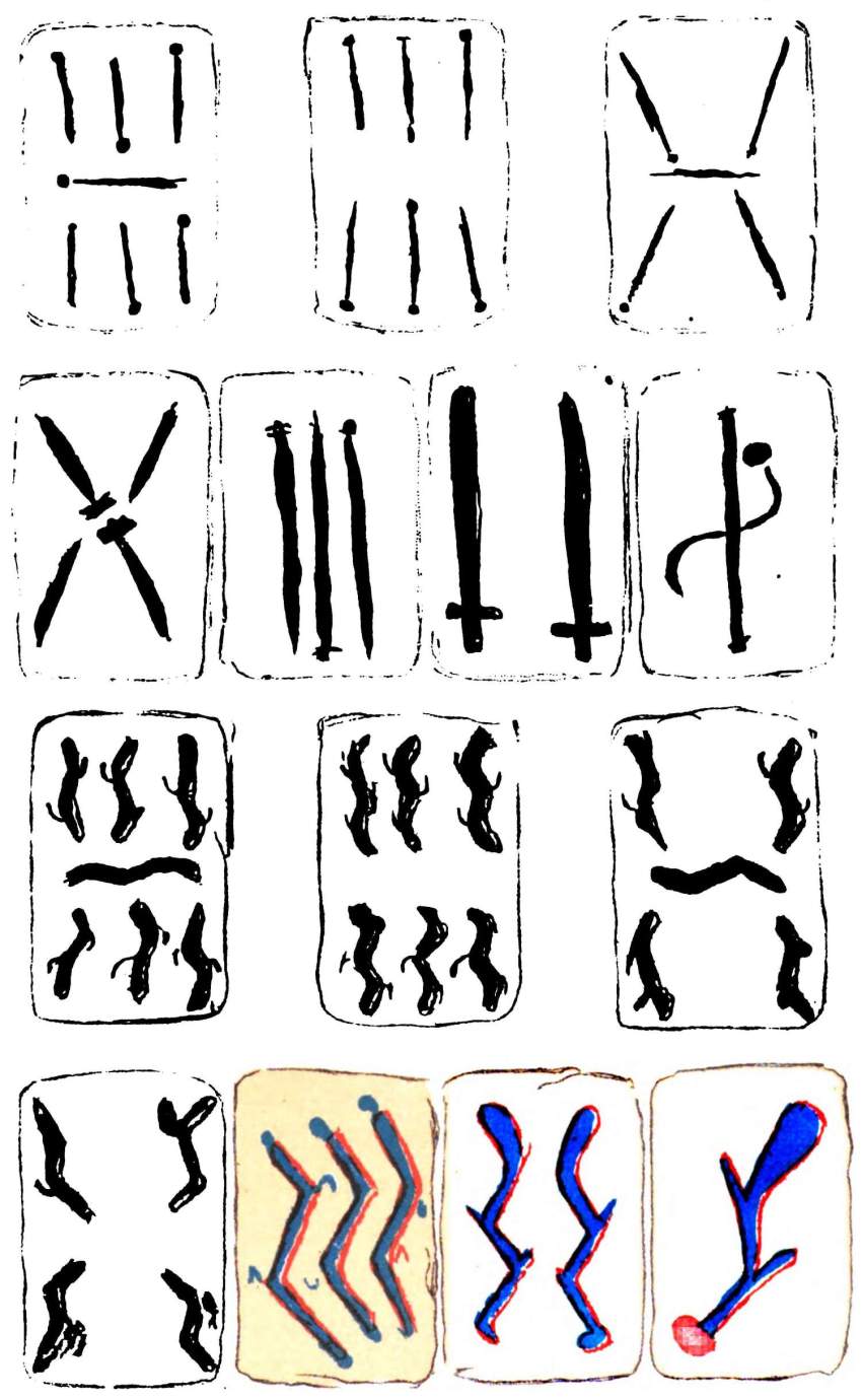 The oldest set of French Piquet cards, known as the “Corsube pack,” which were invented about 1425, or nearly five hundred years ago, are engraved on wood and coloured. The outlines are printed in pale ink, and the colours appear to have been applied by means of a stencil. A beautiful pack engraved on copper in the latter quarter of[Pg 195] the fifteenth century was not intended to be coloured, as the symbols which marked the suits distinguished them without resorting to different hues.