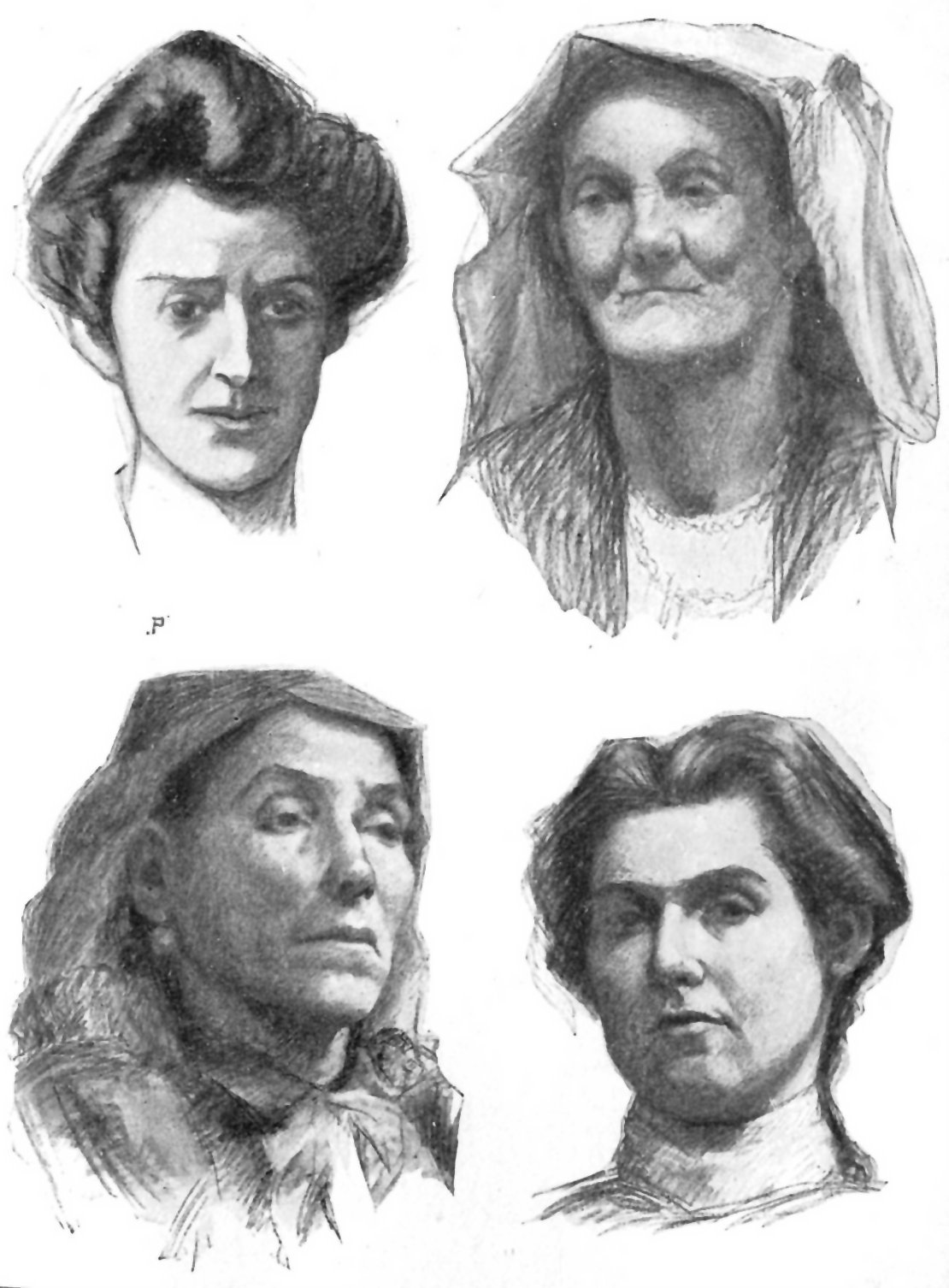 The tone of the garments is somber and gray, blending with the gray of the dawn; or red, blending with the earth stains of the peculiar Southern soil; or claylike and pale yellow. Many of the faces are pallid, some are tense, most of them are indifferent, dulled by toil and yet not all unintelligent. Those who are familiar with the healthy type of the decent workmen of the West and East must draw their distinctions as they consider this peculiar, unfamiliar class. The Southern mill-hand's face is unique—a fearful type, whose perusal is not pleasant or cheerful to the character-reader, to the lover of humanity or to the prophet of the future. Thus they defile: men with felt hats drawn over their brows; women, sunbonneted or hatless; children barefoot, bareheaded, ragged, unwashed. Unwashed these labourers have gone to bed; unwashed they have arisen. To their garments cling the bits of cotton, the threads of cotton, the strands of roping, badges of their trade, brand of their especial toil. As they pass over the red clay, over the pale yellow sand, the earth seems to claim them as part of her unchanging phase; cursed by the mandate primeval—"by the sweat of thy brow"—Earth-Born!