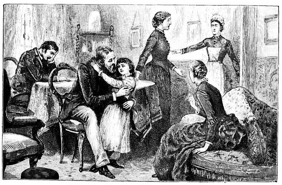 He gasped again as if for breath, and then drew away, retreating a little. “Mary,” he said, “perhapth she’s right. I’ll be better in my own place.” As he stood thus irresolute, feeble, with a woman on each side of him, a picture of a bewildered soul cowed with long subjection, there came into the movement of the strange little drama another unexpected actor. Hetty had{374} sprung up from her sofa, forgetting her weakness, putting out her hands at first as if to keep away the sight; and her movement had disturbed Rhoda, who sprang up too, and stood for a moment astonished, taking in the scene. Then with a cry the little girl flung herself forward, clutching at the grey coat, clinging to his knees. “Father!” she cried. Her little voice, shrill in its childish tones, rang through the air like the ring of a pistol shot, clearing away the mist. He gave a great, sobbing cry, shook himself clear, and stooping down, gathered the child into his arms. They all stood round, a group of hushed spectators, to watch that meeting. He seemed to grope for a chair, and sat down and folded her to him. “My little girl, my darling! my little girl, my darling! I’ve found you at latht!” Hetty tottered across the floor to her mother, and caught her arm and clung to her, hiding her head upon Mary’s shoulder. And behind them all young Darrell came in, and stood looking on like the rest.