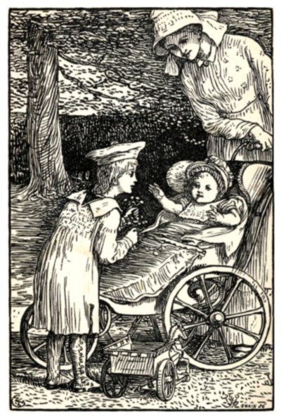 But poor baby Ted had not long to wait for his share of the troubles which we are told come to all, though it does seem as if some people, and children too, had more than others. He was a very delicate little baby. His mother did not notice it at first because, you see, he was the first baby she had ever had of her very own, and she was too pleased to think him anything but perfect. And indeed he was perfect of his kind, only there was so little of him! He was like one of those very, very tiny little white flowers that one has to hunt under the hedges for, and which surprise you by their daintiness when you look at them closely. Only such fragile daintiness needs tender handling, and these little half-opened buds sometimes shrink from the touch of even the kindest of mothers and nurses, and gently fade out of their sight to bloom in a sunnier and softer clime than ours. And knowing this, a cold chill crept round the heart of little Ted's mother when his nurse, who was older and wiser than she, shook her head sadly as she owned that he was about the tiniest baby she had ever seen. But the cold chill did not stay there. Ted, who was scarcely a month old, gave a sudden smile of baby pleasure as she was anxiously looking at him. He had caught sight of some bright flowers on the wall, and his blue eyes had told him that the proper thing to do was to smile at them. And his smile was to his mother like the sun breaking through a cloud.