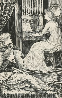 When he woke the room was quite dark; the clouds had hung their dusters over the moon's face by mistake perhaps, or else she had got tired of shining and had turned in for a nap, thought Gratian sleepily. He shut his eyes again, and curled himself round the other way, and would have been asleep again in half a minute, but for a sound which suddenly reached his ears. Some one was talking near him! Gratian opened his eyes again, forgetting that that could not help him to hear, and listened. Yes, it was a voice—two voices; he heard one stop and the other reply, and now and then they seemed to be talking together, and gradually as he listened he discovered that they came from the direction of[Pg 10] the fireplace. Could it be the voices of his father and mother coming up from below, through the chimney, somehow? No, their voices were not so strangely soft and sadly sweet; besides their room was not under his, nor did they ever talk in the middle of the night.