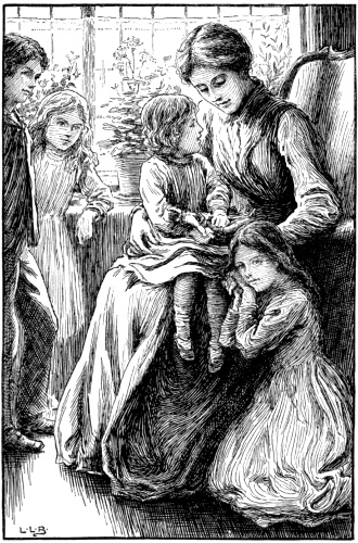 I was standing at our cottage door that afternoon—a beautiful summer afternoon it was, early in June. I was looking idly enough across the common, for our cottage stood—stands still, perhaps—I have not been there for many a year—just at the edge of Brayling Common, where it skirts the pine-woods, when I saw them pass. Quite a little troop they looked, though they were scarcely near enough for me to see them plainly. There was the donkey, old Larkins's donkey, which they had hired for the time, with a tot of a girl riding on it, the page-boy leading it, and a nursemaid walking on one side, and on the other an older little lady—somewhere about ten years old she looked, though she was really only eight. What an air she had, to be sure! What a grand way[Pg 3] of holding herself and stepping along like a little princess, for all that she and her sisters were dressed as simple as simple. Pink cotton frocks, if I remember right, a bit longer in the skirts than our young ladies wear them now, and nice white cotton stockings,—it was long before black silk ones were the fashion for children,—and ankle-strap shoes, and white sun-bonnets, made with casers and cords, nice and shady for the complexions, though you really had to be close to before you could see a child's face inside of them. And some way behind, another little lady, a good bit shorter than Miss Bess—I meant to give all their names in order later on, but it seems strange-like not to say it—and looking quite three years younger, though there was really not two between them. And alongside of her a boy, thin and pale and darkish-haired—that, I could see, as he had no sun-bonnet of course, only a cap of some kind. He too was a good bit taller than Miss ——, the middle young lady I mean, though short for his age, which was eleven past. They were walking together, these two—they were mostly always together, and I saw that the boy was a little lame, just a touch, but enough to take the spring out of his step that one likes to see in a young thing. And though I couldn't[Pg 4] see her face, only some long fair curls, long enough to come below the cape of her bonnet, a feeling came over me that the child beside him was walking slow, keeping back as it were, on purpose to bear him company. There was something gentle and pitying-like in her little figure, in the way she went closer to the boy and took his hand when the nurse turned round and called back something—I couldn't hear the words but I fancied the tone was sharp—to the two children behind, which made them press forward a little. The other young lady turned as they came nearer and said something with a sort of toss-up of her proud little head to the nurse. And then I saw that she held out her hand to her younger sister, who kept hold all the same of the boy's hand on the other side. And that was how they were walking when they went in among the trees and were lost to my sight.