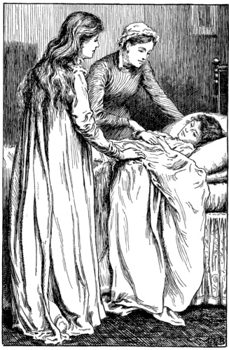 Sad as I was, and though I could scarcely have believed it of myself, I had scarcely laid my head down before I too, like the children, fell fast asleep. I was dreaming, a strange confused dream, which I never was able to remember clearly; but it was something about searching in the smugglers' caves for Master Francis, followed by an old man, who I somehow fancied was the miser baronet, Sir David. His hair was snow white, and there was a confusion in my mind of thinking it like Miss Lally's wool. Anyhow, I had got the idea of whiteness in my head, so that, when something woke me—afterwards I knew it was the sound of my own name—and I opened my eyes to see by the glimmer of the night-light what seemed at first a shining figure by my bed-side, I did[Pg 173] not feel surprised. And the first words I said were 'white as wool.'