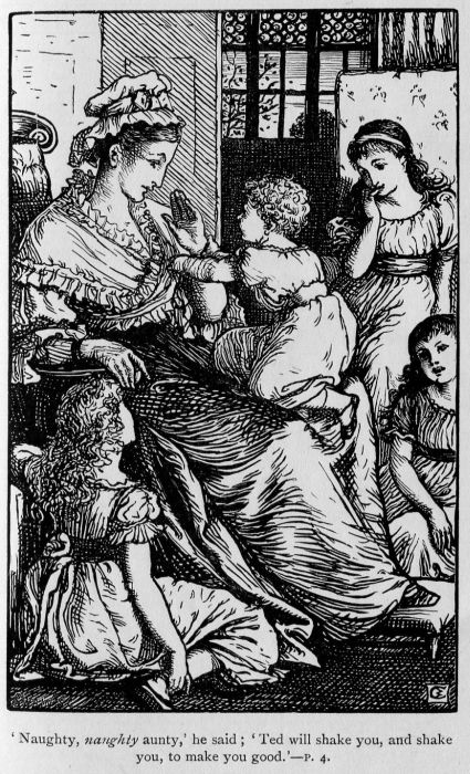 It was one of these—the rosiest and nicest of them all, little Ted—who pulled my dress and whispered, but loud enough for every one to hear, with his coaxingest voice—“Tell me a story, aunty.” And then it came all round in a regular buzz, in every voice, repeated again and again—“O aunty! do; dear, dear aunty, tell us a story.”