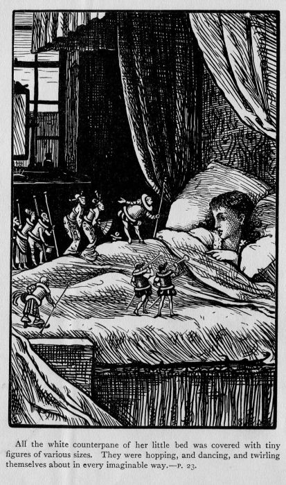 Louisa rubbed her eyes and looked about her to some purpose, for what do you think she saw? All the white counterpane of her little bed was covered with tiny figures, of various sizes, from one inch to three or four in height. They were hopping, and dancing, and twirling themselves about in every imaginable way, like nothing anybody ever saw before, or since, or ever will again.