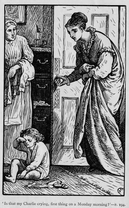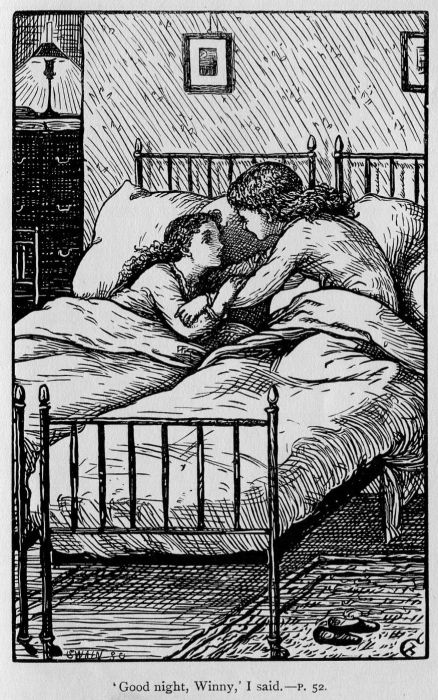 “The child’s going out of his mind!” exclaimed she, vainly endeavouring to stop his tears. His little heart bursting with sorrow, poor Charlie got slowly out of bed, and sitting down on the floor, shaking with sobs and cold, began to try to put on his socks. But just then a tap came to the door, and a voice said, “Is that my Charlie crying, first thing on a Monday morning?” And Charlie jumped up and ran, all shaking and shivering, to his nice warm mother, who took him in her arms and carried him off just as he was, to dress him in her own room, where there was a beautiful fire; and there poor Charlie told his story. He could not help crying again when he came to the end and tried to describe his bitter disappointment. His mother did not speak, and he began to fear she was displeased; but when he looked up in her face, and saw tears in her pretty kind eyes, he knew she was not vexed with him.