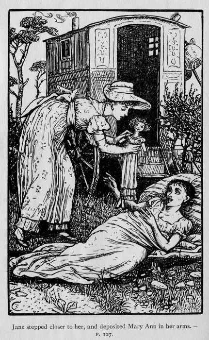 Tom’s employment was more wonderful still. He was playing with Lily, who was sitting perched upon his shoulder, laughing and screaming with delight. As soon as she saw Charlie she slid down, and holding Tom’s great rough hand in her tiny one, pulled him along the lane towards her little friend.