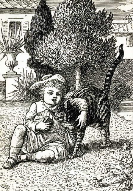 She was half rising from her seat, whispering to the lady beside her (the lady who did know all about it), "I don't know how I shall get through dinner," when—what was it?—no bell had rung, there was no sound that any one else heard, what could it have been that mother heard? I don't know what it was, and I daresay mother herself could not have told, but something she did hear. For she stopped short, and a sort of eager look came into her eyes and a flush into her cheeks. And then the other people in the room seemed to catch the infection, and everybody else looked up to see what was coming, and in the silence a sort of fumbling was heard at the door. It only lasted a second or two, then somehow the handle turned, much more quickly than was usually the case when it was Baby's small hands that were stretching up to reach it—I rather think some one must have been behind to help him—the door opened and—oh such a funny little figure came in! You know who it was of course, but it would be very difficult to tell you exactly what he looked like. He was dressed just as he had been for playing in the garden—a little short thick jacket over his holland blouse, which was no longer very clean; his short scarlet socks and oldest boots on his legs, the bare part of which looked very red and cold, and what had been his best straw hat with part of the brim dangling down, on his curly head. But he seemed quite pleased with himself—that was another of Herr Baby's "ways"; he always did seem quite pleased with himself, best of all, I think, when he had his oldest clothes on—he trotted into the room just as he would have trotted into the garden, even though there were a good many rather finely-dressed ladies and gentlemen sitting round—for his whole mind was filled with the thoughts of two big paper parcels which he carried in his arms. They could not have been as heavy as they were big, or else he could not possibly have carried them! And close at his heels, making him look still funnier, came Minet, very pleased, I am sure, to find herself again in sight of a fire.