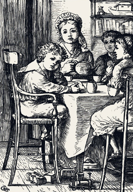 When they had got most of their questions answered, they all found out they were very hungry, and they set to work at their tea, and for a while there was silence in the nursery. Suddenly Baby leant his two elbows on the table and looked round.