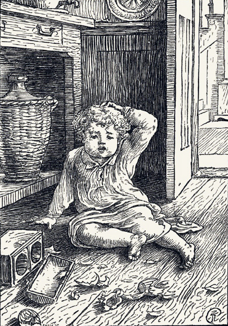 "No, in a boat," replied Baby, forgetting to notice that this was an "inrumption," "in a werry 'normous boat. All's going. Him was looking for 'tamps in mother's basket of teared letters under the little table, and mother and ganfather and auntie didn't know him were there, and ganfather said to mother somesing him couldn't understand—somesing about thit house, and mother said, yes, 'twould be a werry good thing to go away 'fore the cold weather comed, and the children would be p'eased. And auntie said she would like to tell the children, but——"